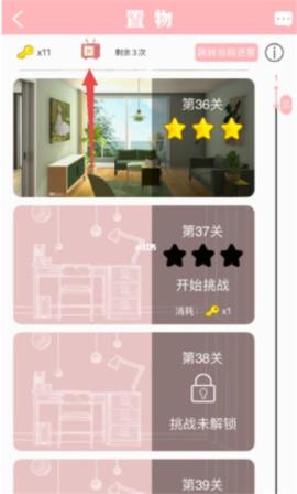 2. 设计挑战:每天会固定提供三把钥匙(当然你也可以选择通过观看广告来额外获取),使用一把钥匙就能开启一个关卡。