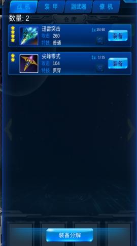 3、点击下方的仓库按钮进入装备选择,战机、装甲、副武器、僚机全部都在这里等你挑选,做好准备就可以痛快地享受游戏了!