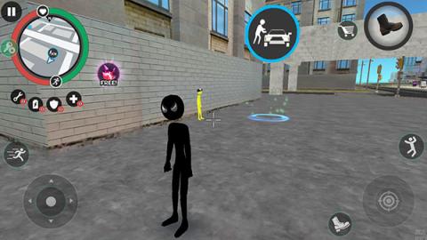 5、通过左侧的摇杆控制火柴人的移动,右侧的钩子图标则可以让你如蜘蛛侠一般随意穿梭;同时,点击“人”图标进行跳跃,而瞄准镜图标则用于攻击敌人。