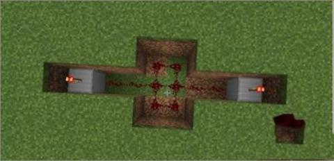 4、开挖一个坑,将红石、固体方块和红石火把放置到位,然后在上面再放固体方块和红石。