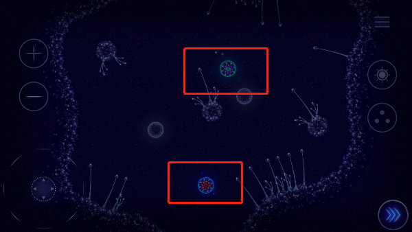 4、当抗体不够时,点击右侧的三个点盘可以分泌更多抗体,左边的加号可用于近距离查看,减号则帮助你获取全局视野。