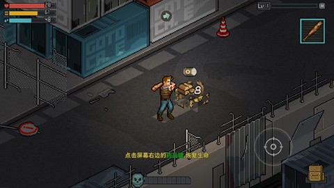 1、刚进入游戏,你会在地上捡到一根棒球棍,这就是你最初的武器,点击屏幕左下角的攻击按钮,便能开始自动攻击附近的僵尸。