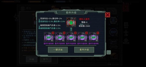 套件品质分为蓝色、紫色、金色和红色,红色套件更是具有传奇属性。用升级材料能让套件变强,获得更多的属性加成。