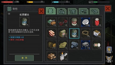 7、同理,饥饿值也需要通过食物补充,而当你的血量下降时,及时使用止血绷带或血包来提升。