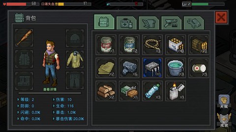 5、点击屏幕右下角的背包,查看你所获得的材料和资源,食物、水、绷带等必不可少的生存物资应有尽有。